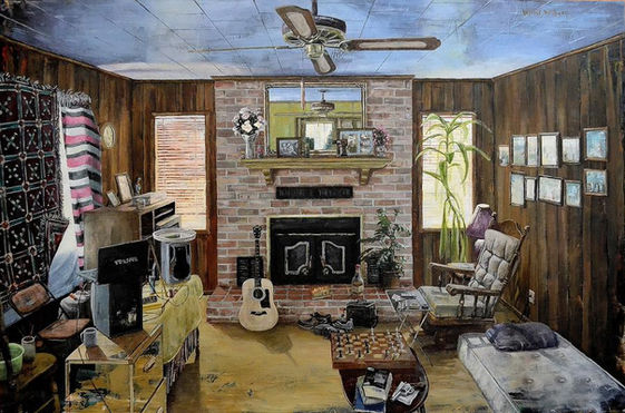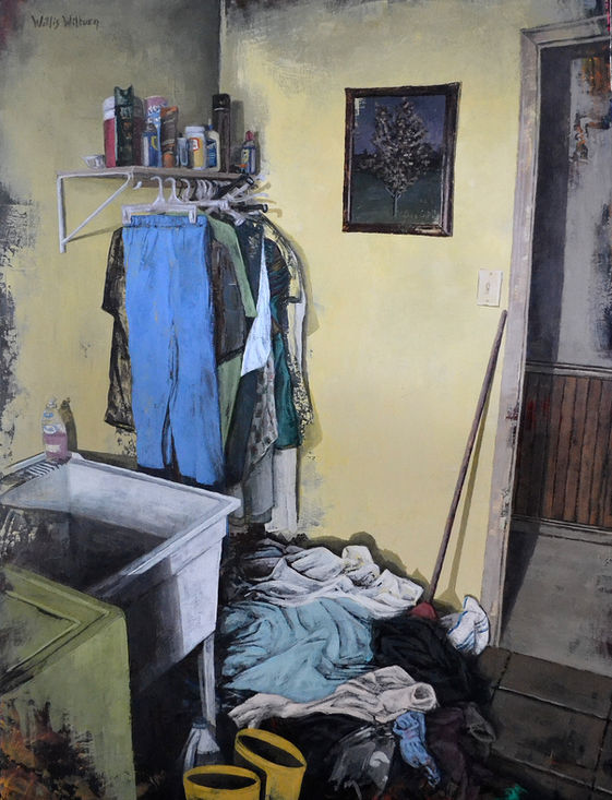 where shadow and light applaud the lonely whimsy of everyday things: liquor bottles, tubes of paint and paint brushes, divorce papers, dirty dishes, a WD40 can, even power cords powering some appliance just off the canvas.